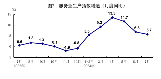 7月份,全國服務業(yè)生產(chǎn)指數(shù)同比增長5.7%。分行業(yè)看,住宿和餐飲業(yè),信息傳輸、軟件和信息技術服務業(yè),金融業(yè),交通運輸、倉儲和郵政業(yè)生產(chǎn)指數(shù)同比分別增長20.0%、11.2%、7.6%、7.3%。1-7月份,全國服務業(yè)生產(chǎn)指數(shù)同比增長8.3%。1-6月份,規(guī)模以上服務業(yè)企業(yè)營業(yè)收入同比增長7.5%。7月份,服務業(yè)商務活動指數(shù)為51.5%,業(yè)務活動預期指數(shù)為58.7%,其中,航空運輸、郵政快遞、電信廣播電視及衛(wèi)星傳輸服務、互聯(lián)網(wǎng)軟件及信息技術服務等行業(yè)商務活動指數(shù)位于60%以上高位景氣區(qū)間。