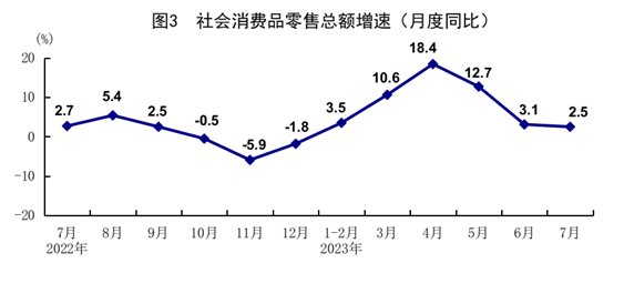 7月份,社會消費品零售總額36761億元,同比增長2.5%,環(huán)比下降0.06%。按經(jīng)營單位所在地分,城鎮(zhèn)消費品零售額31920億元,同比增長2.3%;鄉(xiāng)村消費品零售額4841億元,增長3.8%。按消費類型分,商品零售32483億元,增長1.0%;餐飲收入4277億元,增長15.8%。在限額以上單位商品零售額中,糧油、食品類,中西藥品類,飲料類,通訊器材類商品零售額分別增長5.5%、3.7%、3.1%、3.0%。1-7月份,社會消費品零售總額264348億元,同比增長7.3%。全國網(wǎng)上零售額83097億元,同比增長12.5%。其中,實物商品網(wǎng)上零售額69856億元,增長10.0%,占社會消費品零售總額的比重為26.4%。1-7月份,服務零售額同比增長20.3%。