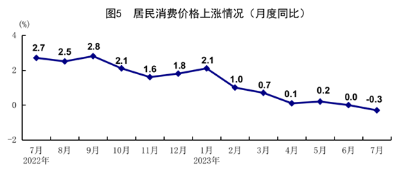 7月份,全國居民消費價格(CPI)同比下降0.3%,環(huán)比上漲0.2%。分類別看,食品煙酒價格同比下降0.5%,衣著價格上漲1.0%,居住價格上漲0.1%,生活用品及服務價格下降0.2%,交通通信價格下降4.7%,教育文化娛樂價格上漲2.4%,醫(yī)療保健價格上漲1.2%,其他用品及服務價格上漲4.1%。在食品煙酒價格中,豬肉價格下降26.0%,鮮菜價格下降1.5%,糧食價格上漲0.3%,鮮果價格上漲5.0%??鄢称泛湍茉磧r格后的核心CPI同比上漲0.8%,漲幅比上月擴大0.4個百分點。1-7月份,全國居民消費價格同比上漲0.5%。