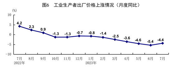 7月份,全國工業(yè)生產(chǎn)者出廠價格同比下降4.4%,降幅比上月收窄1.0個百分點;環(huán)比下降0.2%。全國工業(yè)生產(chǎn)者購進價格同比下降6.1%,降幅比上月收窄0.4個百分點;環(huán)比下降0.5%。1-7月份,全國工業(yè)生產(chǎn)者出廠價格和購進價格同比分別下降3.2%和3.5%。